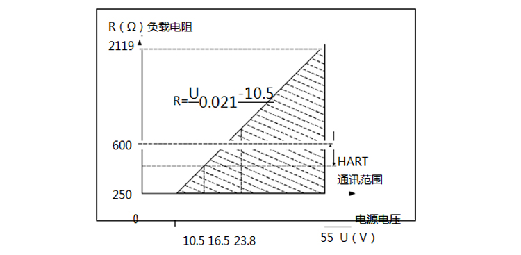 | 項目操作條件標準型/隔爆型10.5-55VDCHART通訊協(xié)議16.5-55VDC ,通訊時負載電阻250Ω負載電阻0-2119Ω為工作狀態(tài),250-600ΩHART通訊傳輸距離<1000米耗電量≤500mW@24VDC,20.8mA |